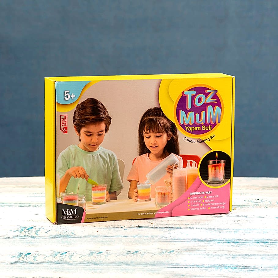 Çocuklarınız ile birlikte eğlenebileceğiniz Toz Mum Yapım Seti. Artık çocuklar için mum yapmak çok kolay ve güvenli. Kutu içinde çocuklar için hazırlanmış renkli toz mumları istedikleri gibi kaplarına döküp fitil takacaklar. Kolaylıkla kendi mumlarını yapabilecekleri gibi becerileride artacak.